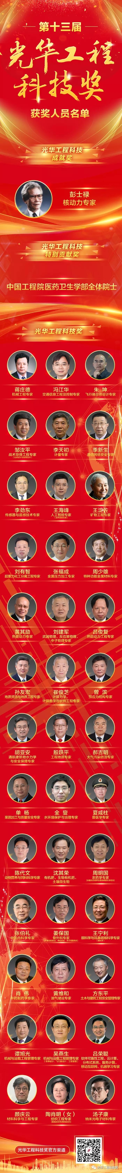 11月8日,第十三屆光華工程科技獎(jiǎng)揭曉儀式在北京隆重舉行。中國兵器工業(yè)集團(tuán)有限公司科技委副主任委員、戰(zhàn)術(shù)導(dǎo)彈工程專家鄒汝平獲第十三屆光華工程科技獎(jiǎng)(獲獎(jiǎng)人員全名單及鄒汝平事跡附后)。 光華工程科技獎(jiǎng)由中國工程院主管,每兩年頒發(fā)一次,目前已是第十三屆,被譽(yù)為“中國工程界最高獎(jiǎng)項(xiàng)”,極大地激勵(lì)了我國工程師、科學(xué)家從事工程科技研究、發(fā)展、應(yīng)用的積極性和創(chuàng)造性。根據(jù)光華工程科技獎(jiǎng)候選人提名要求,候選人需在重大工程設(shè)計(jì)、研制、建造、生產(chǎn)、運(yùn)行、管理等方面解決關(guān)鍵科學(xué)技術(shù)問題或在工程科學(xué)技術(shù)及工程管理領(lǐng)域有重要發(fā)現(xiàn)、發(fā)明,并有顯著應(yīng)用成效,或者是應(yīng)用本人研究成果、發(fā)明創(chuàng)造,發(fā)展高新技術(shù)及相關(guān)產(chǎn)業(yè),成效特別顯著者才可提名。今年,全國范圍內(nèi)共產(chǎn)生了296名有效候選人。 此次揭曉儀式正式公布了從296名候選人中評選出的第十三屆光華工程科技成就獎(jiǎng)、光華工程科技特別貢獻(xiàn)獎(jiǎng)以及光華工程科技獎(jiǎng)的獲得者,最終僅有40位專家和1個(gè)團(tuán)體獲獎(jiǎng)。本屆光華工程科技獎(jiǎng)的獲獎(jiǎng)科學(xué)家們,緊密圍繞國家重大戰(zhàn)略需求,瞄準(zhǔn)經(jīng)濟(jì)建設(shè)和事關(guān)國家安全的重大工程科技問題,緊貼新時(shí)代社會民生現(xiàn)實(shí)需求和軍民融合需求,加快自主創(chuàng)新成果轉(zhuǎn)化應(yīng)用,為創(chuàng)新驅(qū)動發(fā)展,建設(shè)科技強(qiáng)國,以及實(shí)現(xiàn)“兩個(gè)一百年”奮斗目標(biāo)和中國夢做出了重要貢獻(xiàn)。 獲獎(jiǎng)人員全名單