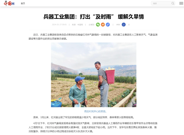 5月27日,中國網(wǎng)刊發(fā)《兵器工業(yè)集團:打出“及時雨” 緩解久旱情》,對中國兵器工業(yè)集團有限公司助力云南省紅河州人工影響天氣、氣象監(jiān)測建設(shè)等方面作出的突出貢獻作了報道。 兵器工業(yè)集團:打出“及時雨” 緩解久旱情 近日,兵器工業(yè)集團收到來自定點幫扶的云南省紅河州氣象局的一封感謝信,對兵器工業(yè)集團在人工影響天氣、氣象監(jiān)測建設(shè)等方面作出的突出貢獻表示感謝。 原來,3月以來,紅河縣出現(xiàn)了罕見的持續(xù)高溫少雨天氣,部分地區(qū)特旱,森林草原火險等級較高。 4月1日下午,紅河州氣象局發(fā)現(xiàn)將會有強對流天氣影響,立即安排兵器造人工增雨作業(yè)車輛前往樂育甲寶作業(yè)點等待實施人工增雨作業(yè),21時20分成功發(fā)射增雨火箭彈4枚,全縣大部地區(qū)下起小雨。當(dāng)天下午,寶華與樂育交界處突發(fā)森林火情,情況較復(fù)雜,持續(xù)20分鐘的小雨過程成功協(xié)助滅火隊員撲滅火情。