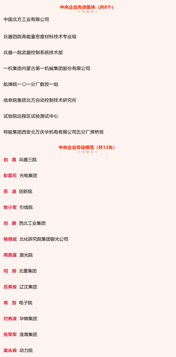 近日,人力資源社會(huì)保障部、國務(wù)院國資委發(fā)布《關(guān)于表彰中央企業(yè)先進(jìn)集體和勞動(dòng)模范的決定》并召開表彰大會(huì),中國兵器工業(yè)集團(tuán)有限公司8個(gè)集體榮獲“中央企業(yè)先進(jìn)集體”稱號(hào),13名個(gè)人榮獲“中央企業(yè)勞動(dòng)模范”稱號(hào)。